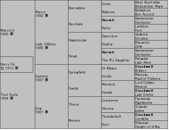 マッチェム Matchem 系のマルコ Marco(1892年生)を経た流れも、ほぼこのカテゴリーに収まっている。Marco は9.66、息子のマルコヴィル Marcovil (1903年生)は9.25、その息子のハリーオン Hurry On(1913年生)は9.80、その息子のコロナック Coronach(1923年生)は9.42、その息子で Nearco の半弟にあたるニッコロデラルカ Niccolo Dell'Arca(1938年生)は9.93。ただ、Hurry On からプレシピテイション Precipitation に分岐したラインは本格的なステイヤー系である。