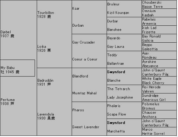 この一覧表には載っていないが、フランスの黄金時代を築き上げたトゥールビヨン Tourbillon とジェベルDjebel の親子は、典型的なステイヤー種牡馬である。しかし、Djebel の息子マイバブー My Babu(1945年生)は、Lady Josephine の影響を受けたバドラディン Badruddin を母の父に持つため、競走馬としても種牡馬としてもスピードを強く表現した。スタミナ・インデックスは8.68で、これは父、2代父とはまったく別タイプの馬であることを示している。My Babu の父系はパーソロンを通じて日本で発展した。シンボリルドルフやメジロマックイーンはこの系統に属している。