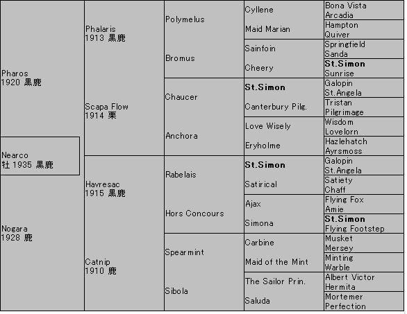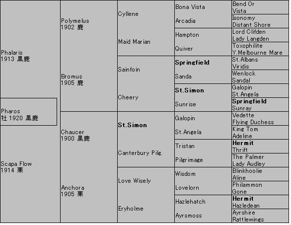 Phalaris の後継種牡馬のなかで最も優れた成績を収めたのは Pharos(1920年生)と Fairway(1925年生)の全兄弟。兄のPharos は現役時代、チャンピオンS(芝10f)に優勝し、英ダービー(芝12f)でも2着となったが、大レースを勝ちまくった弟の Fairway に比べると、能力的な見劣りは否めなかった。種牡馬としては2頭とも成功し、いずれもリーディング・サイアーに輝いている。スタミナ・インデックスの数値も、Pharos が9.00、Fairway が8.96と接近している。