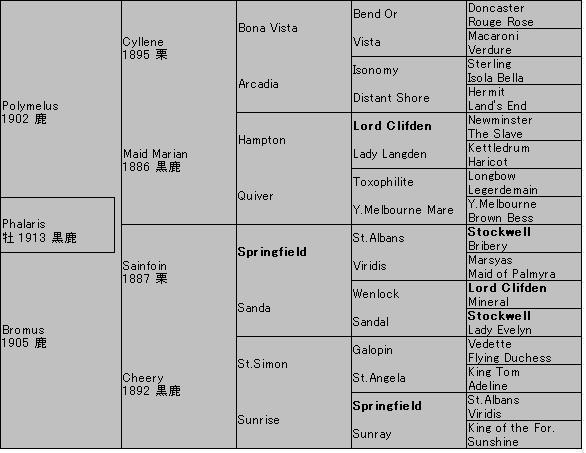8.01の Phalaris(1913年生)は、現代の主流父系の祖ともいえる存在である。ノーザンダンサー Northern Dancer やネイティヴダンサー Native Dancer をはじめ、現在世界で成功している種牡馬の大半が、その父系をたどると Phalaris に行き着く。父ポリメラス Polymelus(1902年生)は計5回リーディング・サイアーに輝いた名種牡馬で、英ダービー馬を3頭送り出したが、どちらかといえばスタミナよりもスピード面の能力を伝えた。スタミナ・インデックスも8.68と小さい。息子の Phalaris は、スプリングフィールド Springfield 2×3のインブリードを持つ母の影響によって、マイル以下の短距離で活躍した。Springfield はジュライC(芝6f)を2連覇した快速馬である。