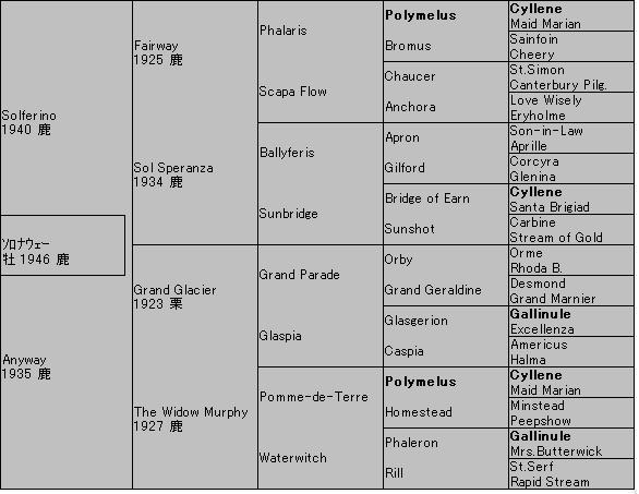 Fairway 系は主にフェアトライアル Fair Trial を通じて勢力を伸ばしたが、この一覧表にはソロナウェー(1946年生)とハロウェー(1940年生)の2頭が入っている。前者は日本に渡ってから、キーストン(日本ダービー)、テイトオー(日本ダービー)、ベロナ(オークス)、ヤマピット(オークス)、ハツユキ(桜花賞)といった優駿を送り出し、1966年にヒンドスタンを抑えてリーディング・サイアーとなった。後者はタニノハローモア(日本ダービー)、スターロッチ(有馬記念、オークス)、アイテイオー(オークス)の父である。この2頭は日本の血統に大きな影響を及ぼした。ハロウェーにはダンテ Dante(1942年生)という半弟がいるが、この2頭は9.66と9.67で、ほとんど数値が同じである。