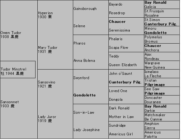 このように、たった1代を経ただけで、系統の特色が大きく変化することがある。オーウェンテューダー Owen Tudor とテューダーミンストレル Tudor Minstrel(1944年生)の関係もそうだ。父 Owen Tudor は十分なスタミナを備えていたが、息子の Tudor Minstrel は Lady Josephine に連なる牝系に属していたため、My Babu と同じくスピードタイプに出た。スタミナ・インデックスは父より1.5以上小さい8.69である。