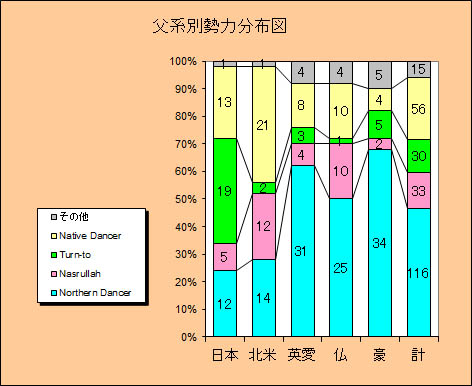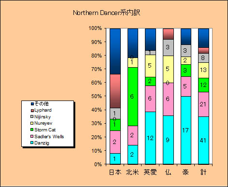 グラフを見ても一目でわかるように、Northern Dancer系が全体の46%と、いまだに他系統と比べても断然の占有率を示している。細かく見るとDanzig系が52頭で全体の37%を占め、以下Sadler's Wells、Storm Cat、Nureyevという順で続いている。