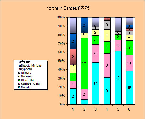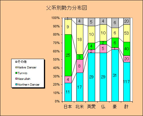 Northern Dancer系の全体占有率は、前年の44.4%から46.8%へとさらに上昇。各国とも少しずつ増加している印象。