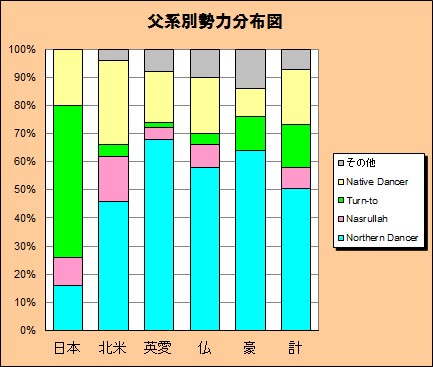 この表は、各国のサイアーランキング上位50頭を系統別に分けて比較したもの。各国の主流血脈が一目でわかり、傾向を掴むには都合の良い表である。