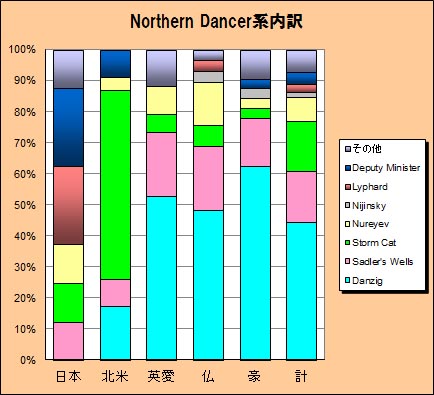 Northern Dancerの内訳を見ると、昨年比でDanzig系が6頭、Storm Cat系も6頭、Sadler's Wells系が2頭増加。日本はNorthern Dancer系が最も少ない国となっており、Danzig系0頭(チーフベアハートの61位が最高)というのは、20頭いる豪州などに比べると異質な印象だ。